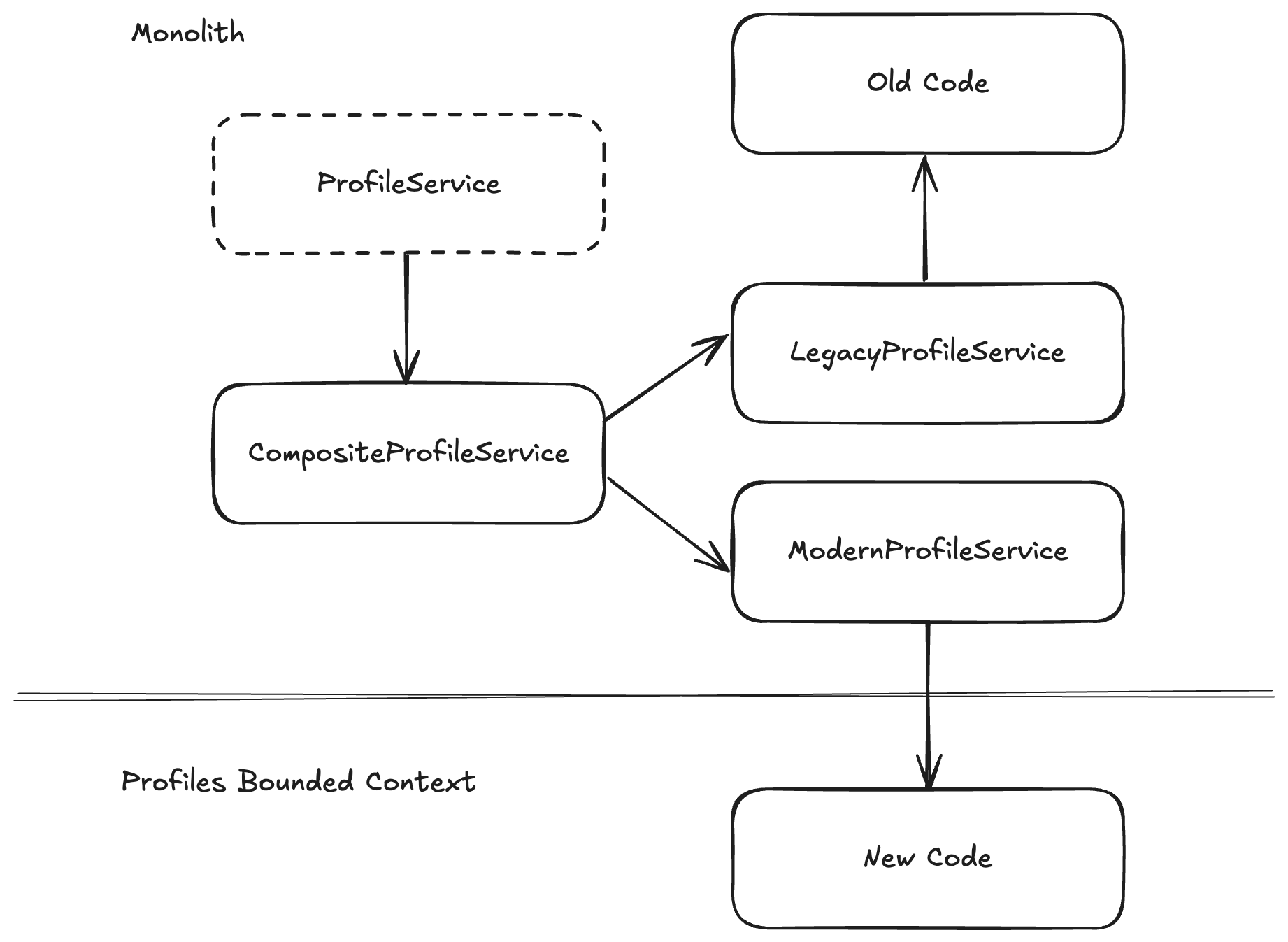 The CompositeProfileService isn't just a routing layer or where we’ll manage the transition between old and new implementations - it’s where we add valuable features like monitoring, logging, and telemetry to track performance and debug issues. It's also where we utilise temporary adapters or anti-corruption layers when needed.